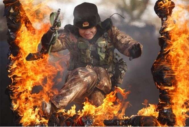 3 – Segurando suas respectivas armas, os solados chineses também passam por um treinamento em que têm que atravessar um círculo em chamas.