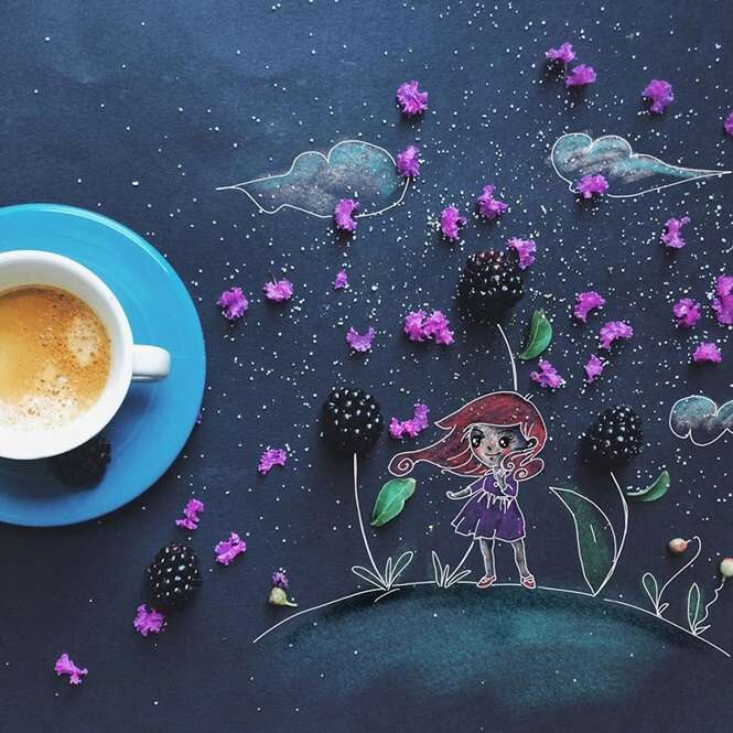 Cinzia Bolognesi é capaz de criar trabalhos incríveis dessa forma! Ela desenha sobre uma folha negra enquanto saboreia seu café da manhã, e inconscientemente suas histórias vão ganhando forma.