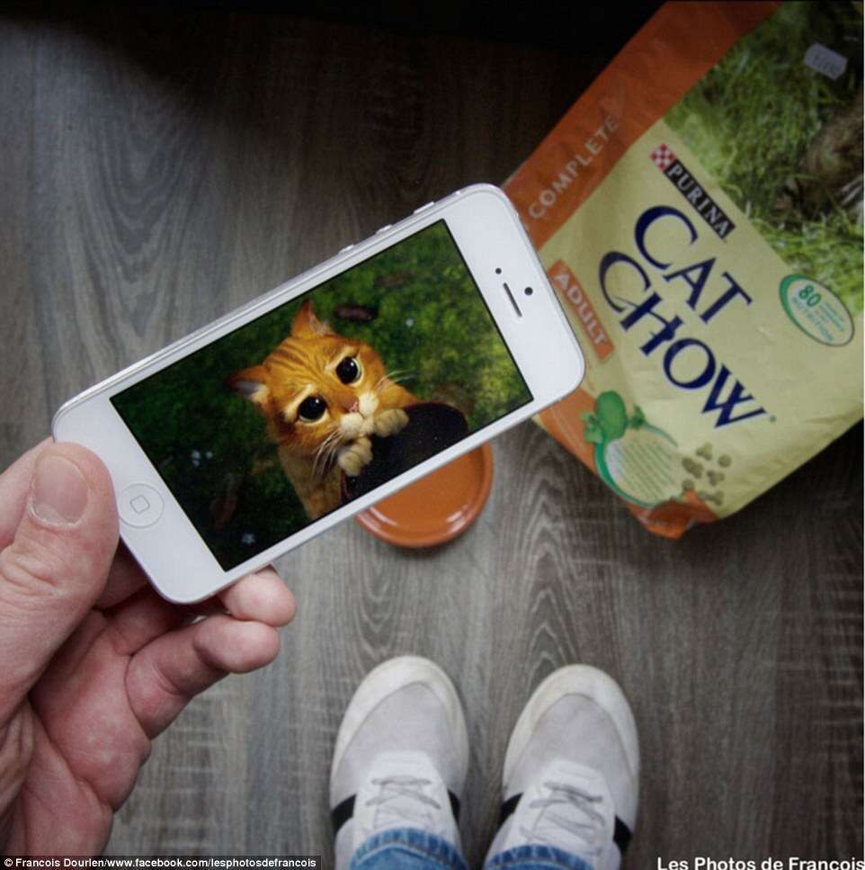 Usando seu smartphone para baixar as fotos, ele posicionou o aparelho na frente dos cenários para produzir o efeito incrível e divertido.