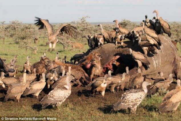 Hiena é flagrada se escondendo em carcaça de elefante morto para não ser devorada por leão faminto