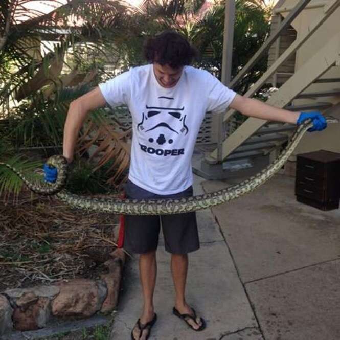 Elliot Budd, de 26 anos, capturou uma cobra píton de 3 metros de comprimento, que foi parar dentro do vaso sanitário de sua casa, em North Ward, Townsville.