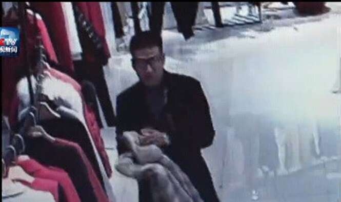Câmeras de segurança flagraram o momento em que dois homens roubaram uma boutique em Kunming, na China. Enquanto um deles distraía a balconista, o outro escondia um casaco de, aproximadamente, R$29.000,00 dentro de sua calça.