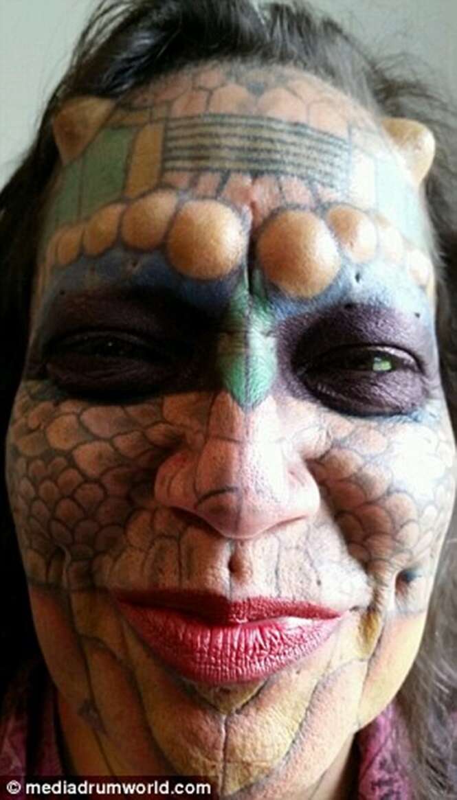 A mulher de 55 anos de idade sofreu uma série de procedimentos dolorosos ao longo dos últimos anos, incluindo a modificação do nariz, extração dentária e coloração dos olhos. Além disso, sua língua passou a ter duas pontas e sua face ganhou tatuagens.