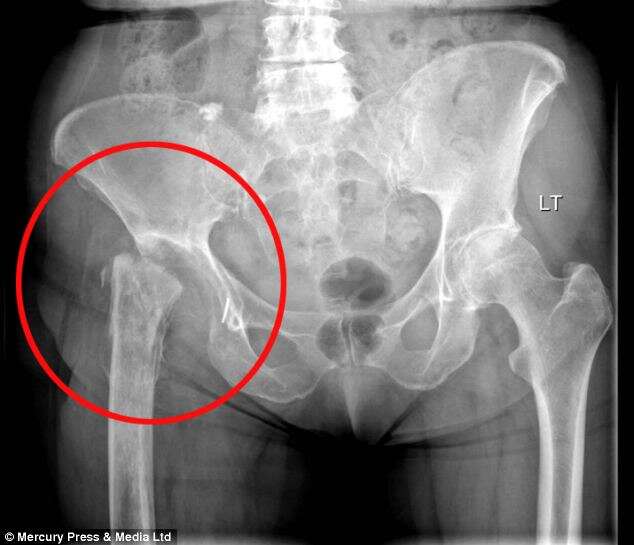 A substituição da anca já foi removida, mas seu osso da perna é agora fundido à pelve, encurtando a perna da mulher em 10 centímetros.