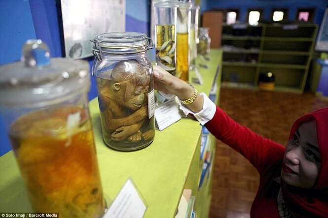 Uma coleção de cerca de 30 espécies de animais preservados – incluindo um pequeno orangotango – ficam guardadas em frascos de vidro.