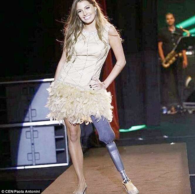 Paola Antonini França Costa, de 21 anos de idade, de Belo Horizonte, Minas Gerais, continua na passarela, porém agora com uma prótese.