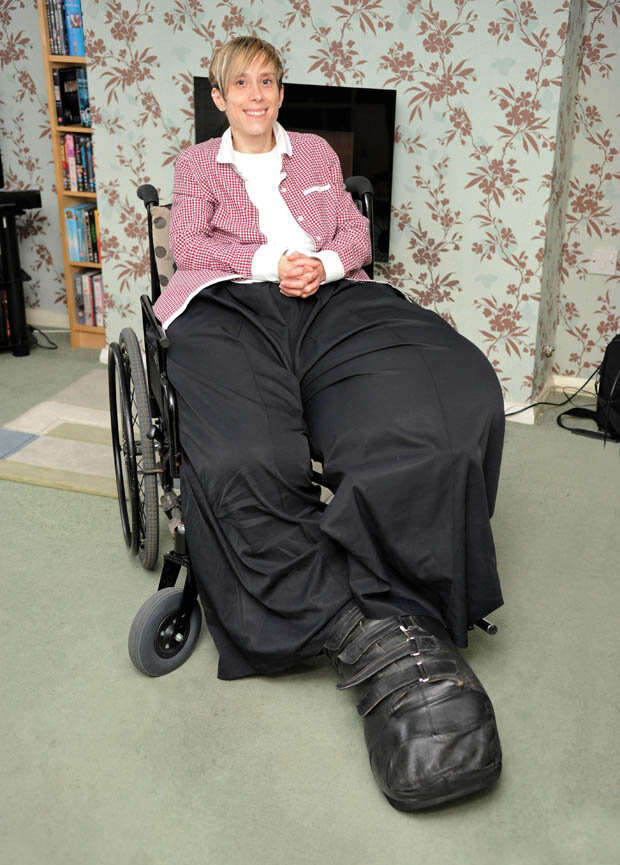A perna direita de Mandy pesa incríveis 107 quilos. Ela teve parte de seu membro esquerdo amputado em janeiro de 2010, ao contrair septicemia.