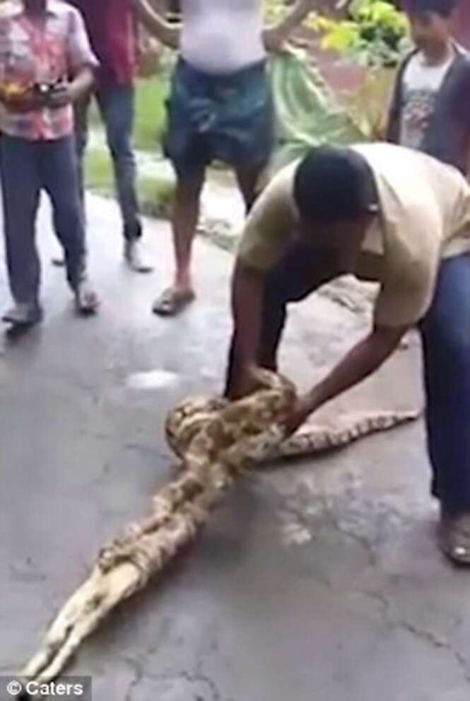 Um vídeo capturou o momento em que um agricultor espremeu a barriga de uma cobra píton com suas próprias mãos para libertar as cabras que o réptil tinha comido.