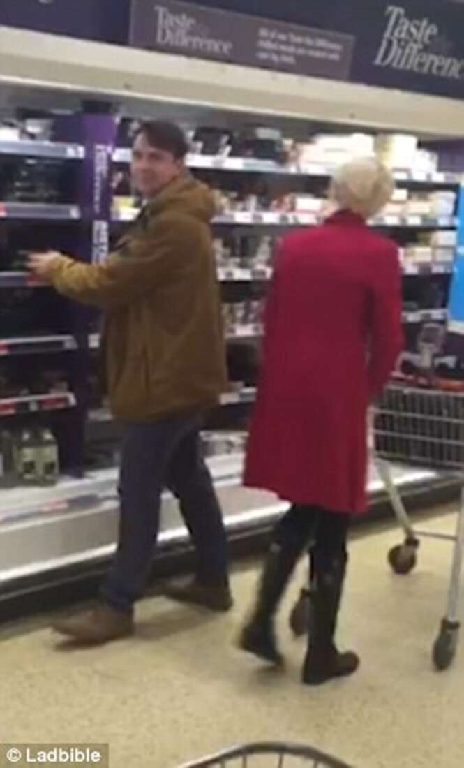 Nas imagens, um homem de 27 anos de idade, identificado apenas como Dan, pode ser visto tentando atrapalhar a própria mãe a fazer compras em um supermercado.
